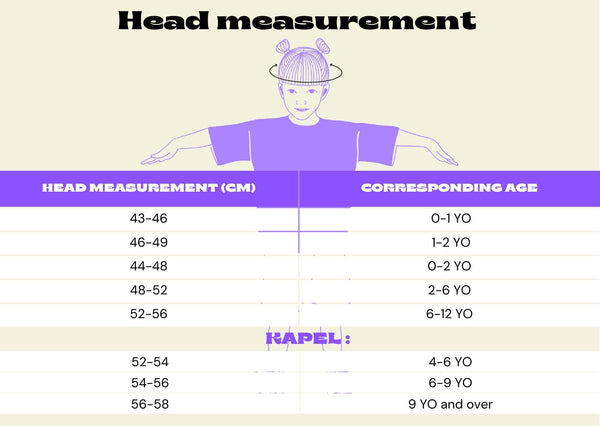 ในการเลือกขนาด ให้วัดเส้นรอบวงศีรษะของลูกเหนือคิ้วและหูขึ้นไป 1 ซม. โดยใช้สายวัด (หรือเชือกสำหรับวัดในภายหลัง) อย่ารัดแน่นเกินไปเพื่อหลีกเลี่ยงการรัดแน่นเกินไป ขนาดที่ระบุคือขนาดสูงสุดสำหรับแต่ละกลุ่มอายุ เลือกขนาดใหญ่ขึ้นหนึ่งขนาดเพื่อความสบายยิ่งขึ้น ตัวอย่าง: สำหรับรอบศีรษะ 48 ซม. ให้เลือกขนาดที่ใหญ่กว่า เช่น 48-52