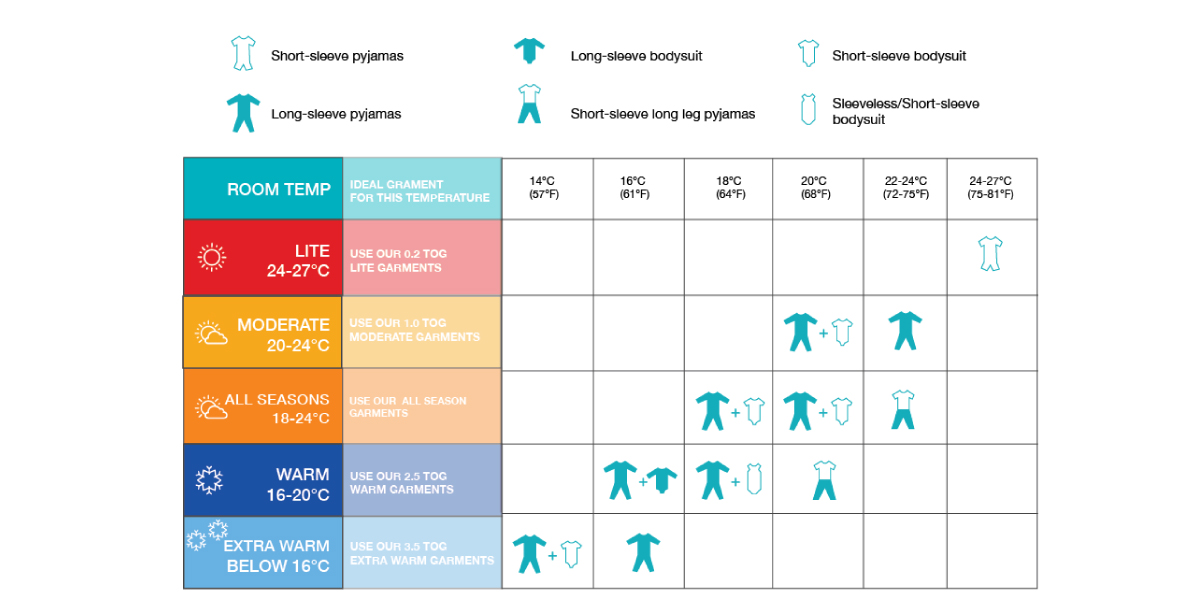 Follow the recommended clothing by room temperature within the TOG temperature chart below.